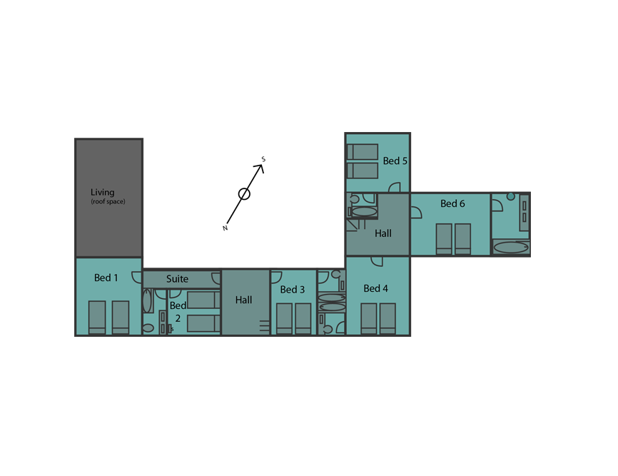 1 additional King-size/twin bedroom with its own hand-basin, sharing one of the bathrooms but separated by a hallway to form a small suite.